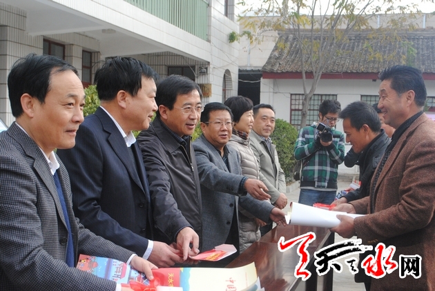 ??? 天天天水網(wǎng)-天水日?qǐng)?bào)訊【記者 令文慧】 11月5日上午,天水市委常委、組織部長(zhǎng)、市村兩委換屆選舉工作領(lǐng)導(dǎo)小組組長(zhǎng)王光慶,副市長(zhǎng)、市村兩委換屆選舉工作領(lǐng)導(dǎo)小組副組長(zhǎng)雷鳴深入秦州區(qū)皂郊鎮(zhèn)賈家寺村,給秦州區(qū)鄉(xiāng)村兩級(jí)送去了村兩委換屆選舉工作手冊(cè)和系列宣傳畫。