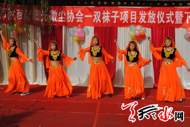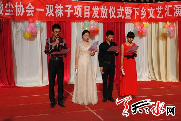????當日,天水師院西部陽光微塵協會“一雙襪子項目”發(fā)放儀式暨下鄉(xiāng)文藝匯演在該村學校院內舉行。據了解,此次發(fā)放的800余雙襪子,是由該協會的同學們利用課余時間撿拾了14000余個塑料瓶變現后買來的。