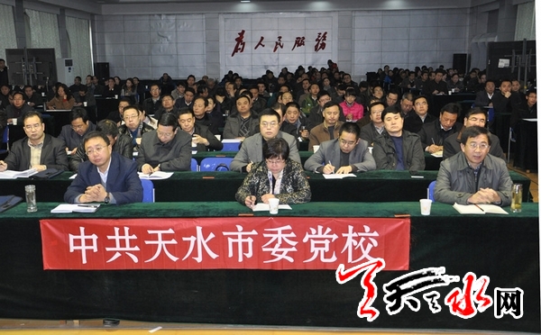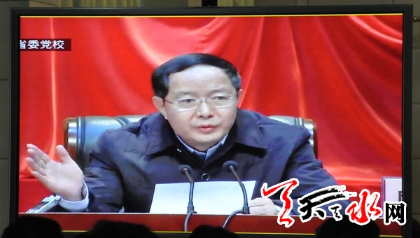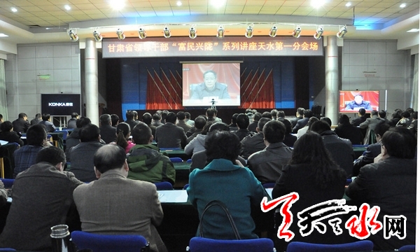 市委常委、紀委書記李美華,市委常委、組織部長王光慶,副市長楊小天,我市200多名機關(guān)干部在天水分會場通過視頻聆聽了講座。