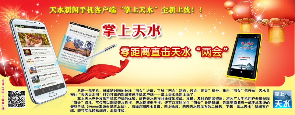 目前,天水日報(bào)社全媒體為全景呈現(xiàn)此次我市“兩會”,已經(jīng)派出近20多人的采訪隊(duì)伍,利用最及時(shí)和最新穎的傳播方式對“兩會”進(jìn)行全程報(bào)道,其中“掌上天水”將會成為此次“兩會”最為便利的瀏覽和閱讀方式,不僅可以瀏覽天水日報(bào)、天水晚報(bào)電子報(bào),還可以實(shí)時(shí)關(guān)注“兩會”最新新聞。只需要您擁有一部安卓系統(tǒng)的智能手機(jī)(iPhone系統(tǒng)也即將上線),掃描近期天水日報(bào)、天水晚報(bào)、天天天水網(wǎng)發(fā)布的二維碼,下載“掌上天水”新聞客戶端,即可實(shí)現(xiàn)輕松閱讀。