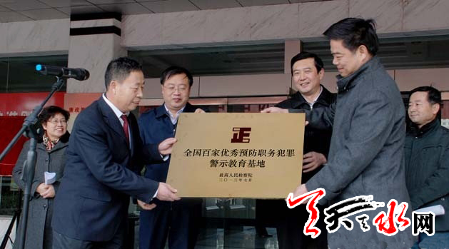 ??? 【天天天水網(wǎng)訊】(記者 呂薇)為了進(jìn)一步推進(jìn)和擴(kuò)大警示教育基地建設(shè)的積極成果,提高質(zhì)量和效果,充分發(fā)揮典型引領(lǐng)和示范作用,最高人民檢察院組織了全國檢察機(jī)關(guān)“百優(yōu)”預(yù)防職務(wù)犯罪警示教育基地評(píng)選活動(dòng),經(jīng)評(píng)選,天水市廉政教育基地獲“全國檢察機(jī)關(guān)百優(yōu)警示教育基地”殊榮。1月7日下午,授牌儀式在位省稅務(wù)干部學(xué)校的我市廉政教育基地舉行。