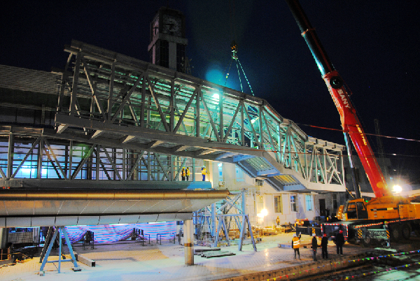 ????為更好地方便旅客乘車(chē),避免旅客進(jìn)出站人員對(duì)流,進(jìn)一步優(yōu)化客運(yùn)組織,提升車(chē)站整體形象,天水車(chē)站于2013年10月8日開(kāi)工建設(shè)全封閉鋼架結(jié)構(gòu)、橫跨鏈接三個(gè)站臺(tái)的單側(cè)下行跨線人行天橋。(強(qiáng)科 劉斌)