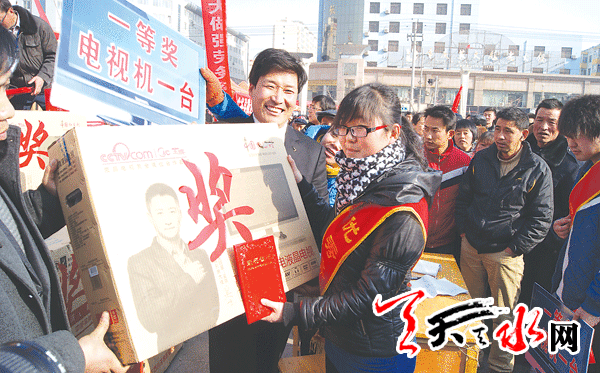 ????天天天水網(wǎng)訊(記者 羅雙紅)1月17日,甘谷縣外出務(wù)工人員在領(lǐng)取獎(jiǎng)品。當(dāng)天,天水市人社局、市勞務(wù)辦聯(lián)合各縣人社、勞務(wù)部門組織的全市“春風(fēng)行動(dòng)”歡迎外出務(wù)工人員回家探親暨表彰優(yōu)秀務(wù)工人員儀式,分別在甘谷縣、武山縣、清水縣、張家川縣同步舉行,全市優(yōu)秀勞務(wù)經(jīng)紀(jì)人和80多名優(yōu)秀務(wù)工人員領(lǐng)取了電視機(jī)、洗衣機(jī)、電飯鍋等總價(jià)值13萬多元的大件獎(jiǎng)品。