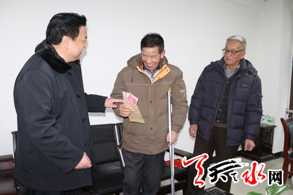 ??? 天天天水網(wǎng)訊(通訊員郭士全 移紅霞)1月22日,天水市政協(xié)副主席何道華給甘肅第五建設(shè)集團(tuán)公司羅吉順等4戶困難企業(yè)軍轉(zhuǎn)干部送去了新春的祝福和慰問金,讓他們?cè)诤懈惺艿近h和政府的溫暖。至此,為期3天的節(jié)前走訪慰問全市困難企業(yè)軍轉(zhuǎn)干部活動(dòng)拉開了序幕。