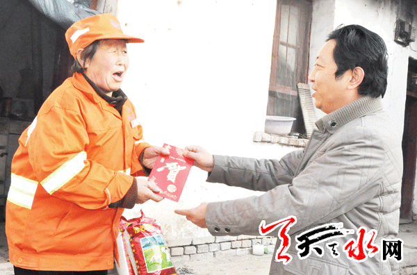 ????“我這么窮困的家庭真的是愁死我了,環(huán)衛(wèi)所能把我留下來掃馬路已經(jīng)就讓我一家子感激不盡了,現(xiàn)在又來給我送錢送米,實在是太感謝了!”1月20日,家住秦州區(qū)張家溝山坡上的特困環(huán)衛(wèi)工人霍猛猛面對前來看望她,并給她送來1000元捐款和兩袋大米的西關(guān)環(huán)衛(wèi)所劉所長一行,感動得幾度哽咽。