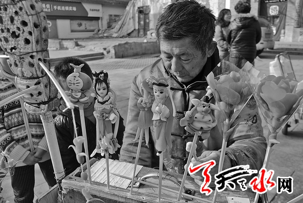 ??? 2月19日下午,冬日的暖陽照耀著秦州大地,大街上人來人往,在陜省會館門前圍了好多人,原來大家是在看捏面人的。