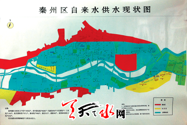 (圖一:秦州區(qū)自來(lái)水供水現(xiàn)狀圖。紅色區(qū)域?yàn)槿彼畢^(qū),黃色為欠壓區(qū),藍(lán)色為正常供水區(qū)域。)