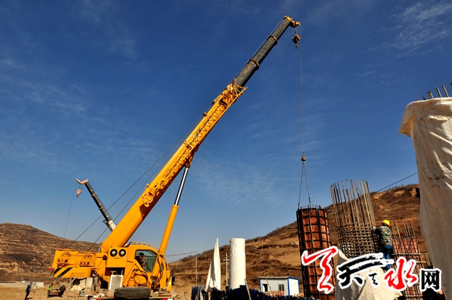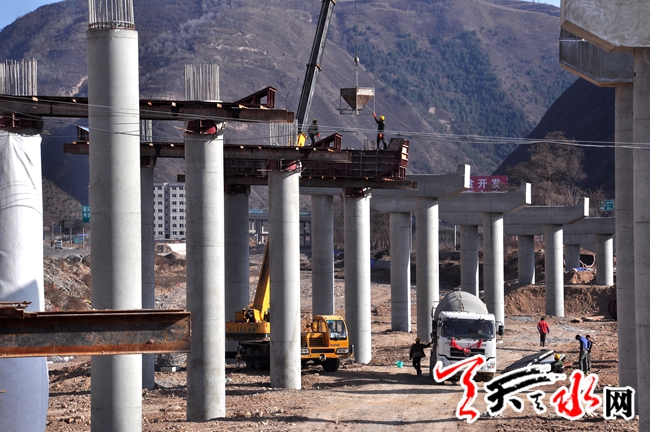 ???? 3月14日,由青島公路建設集團承建的十天高速公路甘肅段土建工程第二十四(ST24)合同段位于天水皂郊段的工人正在利用機械澆筑水泥橋墩。