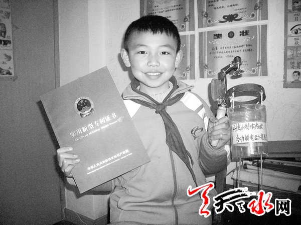 ??? 天天天水網(wǎng)-天水晚報訊【記者柏拓】3月18日,對天水市實驗小學五一班11歲學生趙著來說,是少年時代最為難忘的一天。因為,這一天他拿到了國家知識產(chǎn)權(quán)局授予的《多功能電動采摘蘋果機》實用新型專利證書。這項專利不僅使果農(nóng)們采摘蘋果和修剪果樹時遇到的難題迎刃而解,還使趙著成了“天水少年專利第一人”。