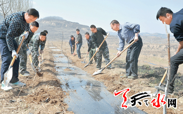 ??? 天天天水網(wǎng)訊(記者 裴婷婷)3月24日,清水縣干部職工在西靈山優(yōu)質(zhì)核桃示范基地幫助當(dāng)?shù)毓r(nóng)整地、覆膜。