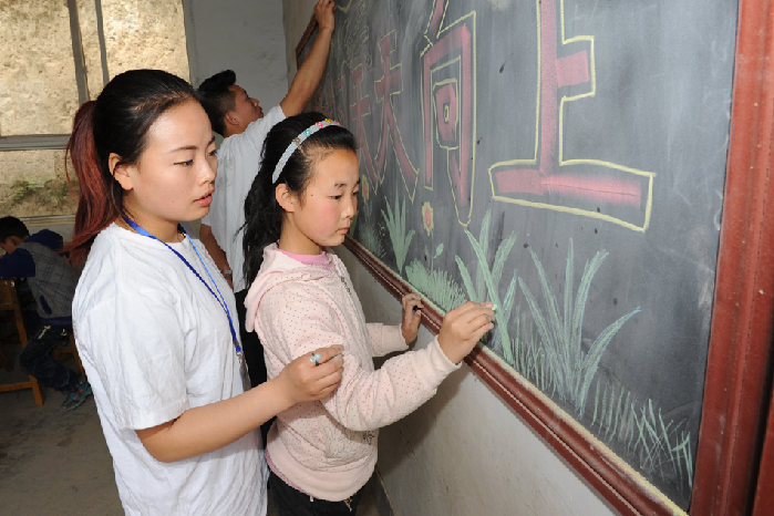 ????活動當天,小雨滴微公益團隊的志愿者們還為學生們輔導怎樣辦黑板報,并送去了棒棒糖和果凍等禮物。