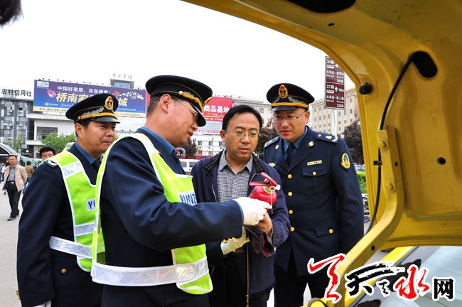 天水市運(yùn)管局局長(zhǎng)張憲泉和麥積分局局長(zhǎng)王立勛在火車(chē)站廣場(chǎng)進(jìn)行檢查