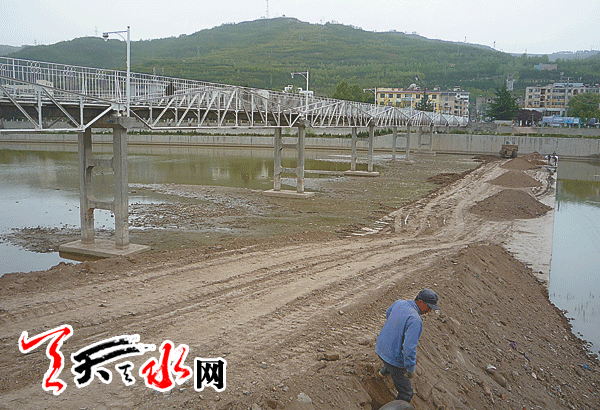 ????在雙橋便橋,記者看到,便橋北端已經(jīng)立起了施工擋板,附近河岸上的部分地磚已經(jīng)被清除。施工單位已經(jīng)進駐施工現(xiàn)場,雙橋便橋以西,已在天水湖的河堤和河床之間開辟了一條施工道路,施工機械正在河床上轉運土方。