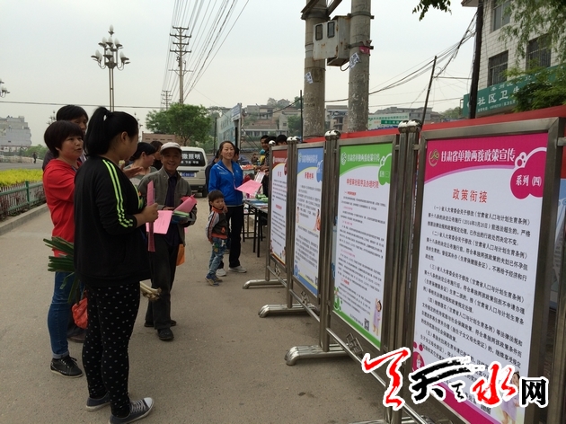 ? 天天天水網(wǎng)訊 為了貫徹落實甘肅省啟動實施“單獨兩孩”政策,做好新政策的宣傳引導和政策解釋工作,5月9日上午,石馬坪街道組織石馬坪社區(qū)工作人員在社區(qū)衛(wèi)生服務(wù)中心門口向轄區(qū)居民宣傳甘肅省單獨兩孩生育政策和秦州區(qū)計劃生育優(yōu)先優(yōu)惠政策。