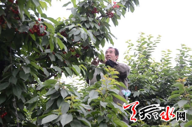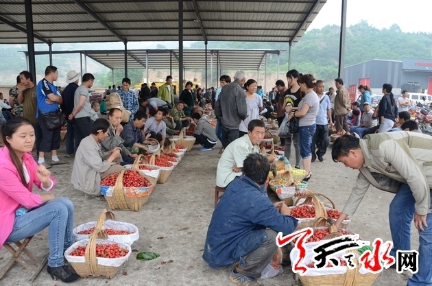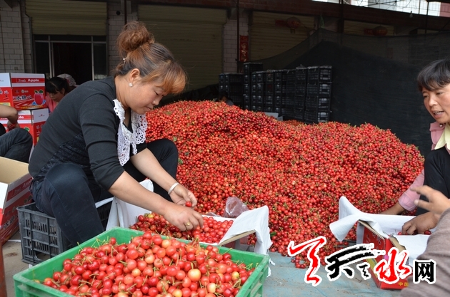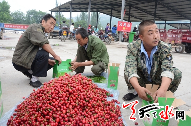 ??? 時間進入五月,當樹上的大櫻桃漸次發(fā)紅,呈現(xiàn)出瑪瑙般紅潤的色澤時,秦州區(qū)玉泉鎮(zhèn)羅峪溝流域和太京鎮(zhèn)、藉口鎮(zhèn)川道區(qū)種植大櫻桃的果農(nóng)們便開始了一年中最為忙碌的時節(jié)。這個時候,他們或開著三輪車、或騎著摩托,穿行于果園和市場之間。在果園,他們手腳麻利地摘下一顆顆成熟的大櫻桃,然后小心翼翼地放到籃子或桶子里,當可供銷售的大櫻桃采摘殆盡時,又馬上騎車將大櫻桃送到市場銷售。在市場,他們興奮而略帶焦急地等待客商的光顧,當客商“相中”他們的大櫻桃,又經(jīng)過一番討價還價之后,一天的勞動成果終于變成一沓鈔票。這時,采摘大櫻桃的辛苦更多的被銷售大櫻桃?guī)淼南矏偹咒N,帶著豐收的愜意,驅(qū)車回到家里,等待采摘第二天成熟變紅的大櫻桃。