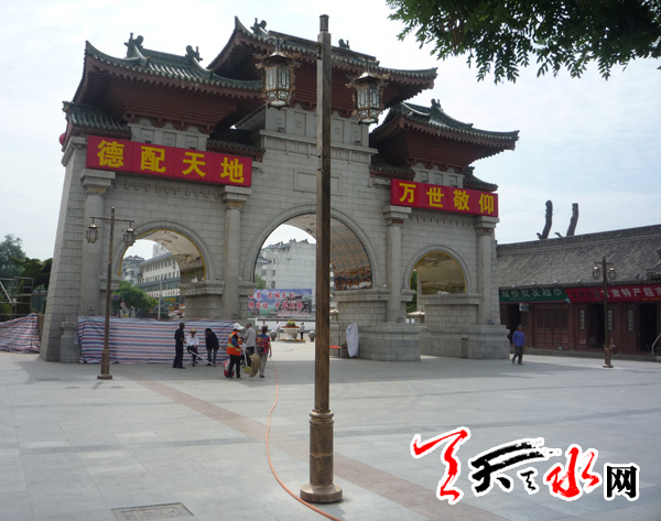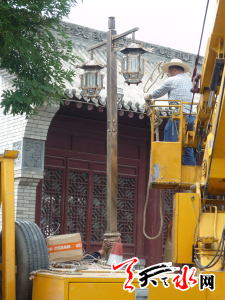 ???天天天水網(wǎng)訊 6月16日,在秦州區(qū)伏羲路步行街,市政部門的工作人員頂著烈日安裝仿古宮燈。