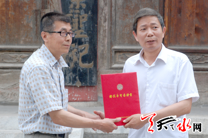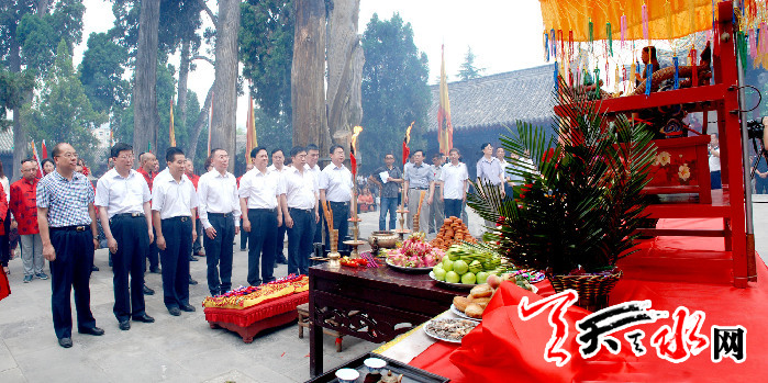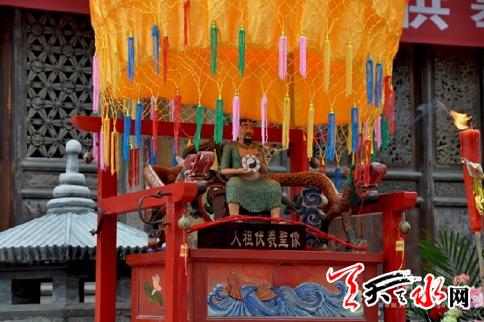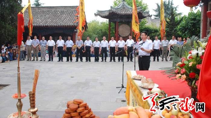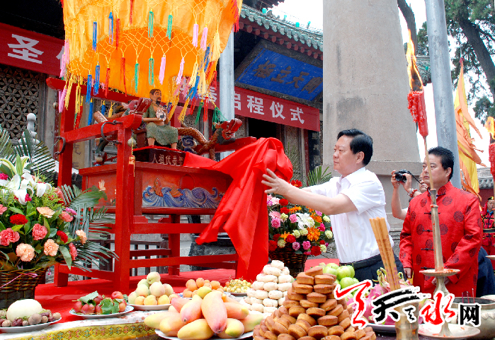 ????天天天水網(wǎng)訊(記者 令文慧)6月18日上午,恭送中華人文始祖太昊伏羲圣像赴臺供奉啟程儀式在伏羲廟舉行。市委副書記、市長楊維俊為太昊伏羲圣像揭彩。????????