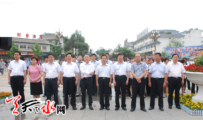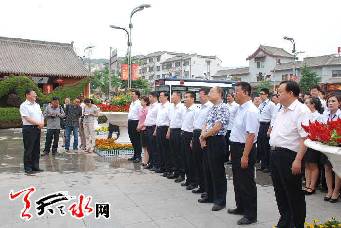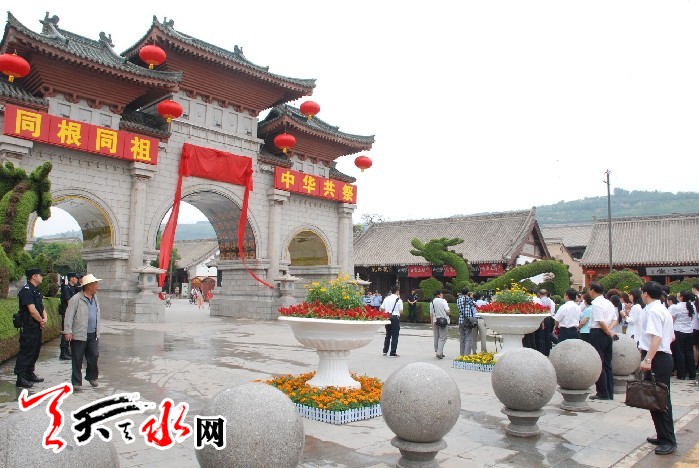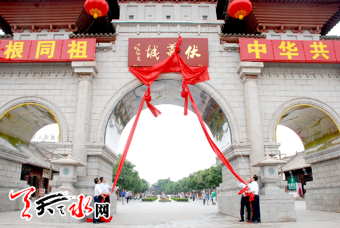 ???? 天天天水網(wǎng)訊(記者令文慧)6月18日上午,市四大組織領(lǐng)導(dǎo)王銳、柴金祥、楊維俊、宋尚有等分別在伏羲城的東西牌坊為著名書(shū)法家歐陽(yáng)中石先生題銘的“伏羲城”匾牌進(jìn)行揭彩。