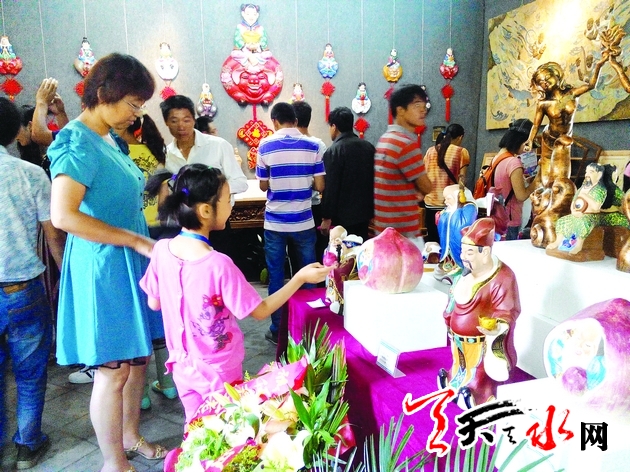 ????記者了解到,此次展出的泥塑作品有60多件,主要以天水伏羲文化、圖騰文化、十二生肖文化為主旨,以深層次的形式表現(xiàn)出天水民間傳說和其文化內(nèi)涵。值得一提的是,我市省級泥塑傳承人何彥云在傳統(tǒng)泥塑創(chuàng)作中,以壁畫的形式,融入圖騰文化元素,結(jié)合民間傳說,創(chuàng)作出泥塑壁掛新品。在他的眾多作品中,尤以仿麥積山石窟肉塑作品吸引了眾多參觀者的眼球。以天水當?shù)啬静睦缒?、核桃木為主的仿明清家具系列,其厚重的色彩,大氣典雅的線條,精美的雕刻花紋,引得眾多觀者感嘆制作者精湛的技藝。壁畫展區(qū)40多幅以麥積山石窟佛像和壁畫的臨摹畫、廟宇道場水陸畫為主。尤其是董瑞軍臨摹的麥積山石窟佛像臨摹畫,讓眾多觀者發(fā)出嘖嘖的贊嘆聲:就像是看到真正的雕塑一般,立體感特別強。不少觀者現(xiàn)場請教其畫法技藝。