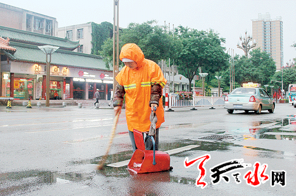 ??? 天天天水網(wǎng)訊【記者王瑩 通訊員呂宏偉】“前天給我們新發(fā)的這衣服好得很,下雨天我們就再也不怕被淋濕了?!?月30日晚,在秦州區(qū)民主西路清掃路面的環(huán)衛(wèi)工人頗為感激地告訴記者。