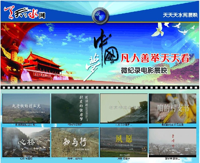 ????天天天水網(wǎng)訊 根據(jù)省委宣傳部《關(guān)于做好“中國夢·凡人善舉天天看”微紀(jì)錄電影展映播放和收看工作的通知》要求,更好地在全市上下宣傳推廣天水市的先進(jìn)人物典型,天天天水網(wǎng)7月7日啟動(dòng)“中國夢·凡人善舉天天看”微紀(jì)錄電影展映。