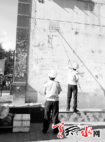 ??? 天天天水網(wǎng)訊【記者閆蓉芳】一夜之間,秦州區(qū)大眾北路臨街建筑的墻體上貼滿了“無抵押貸款”的非法小廣告,不法分子為達(dá)到宣傳目的并避免被清除,故意將小廣告貼得很高。8月25日上午,秦州區(qū)綜合執(zhí)法局執(zhí)法人員在巡查中發(fā)現(xiàn)這一情況后,立即找來長竹竿或梯子,想辦法清除小廣告,清理不掉的,就用小鏟鏟除,不讓非法小廣告影響市容。