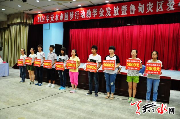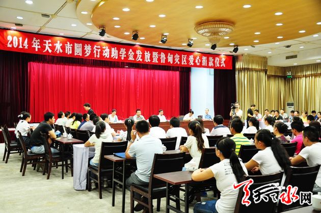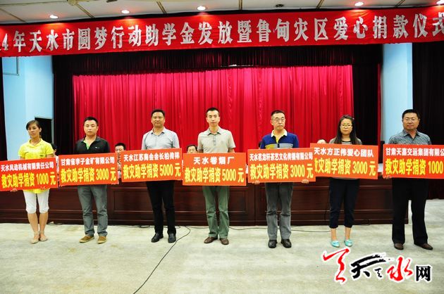 ??? 天天天水網(wǎng)訊【記者 童強(qiáng)】 8月26日,由共青團(tuán)天水市委牽頭組織的2014年天水市圓夢助學(xué)行動助學(xué)金發(fā)放暨魯?shù)闉?zāi)區(qū)愛心捐贈儀式在天水迎賓館舉行。