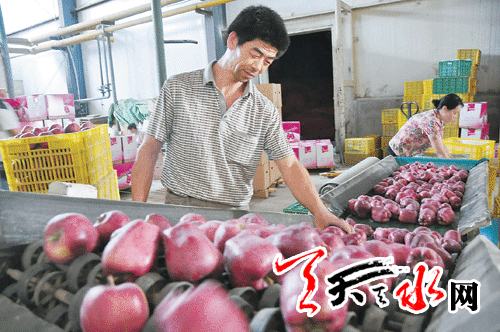 ??? 8月28日,麥積區(qū)花牛鎮(zhèn)花牛村村民對剛采摘的花牛蘋果進(jìn)行分類、裝箱。