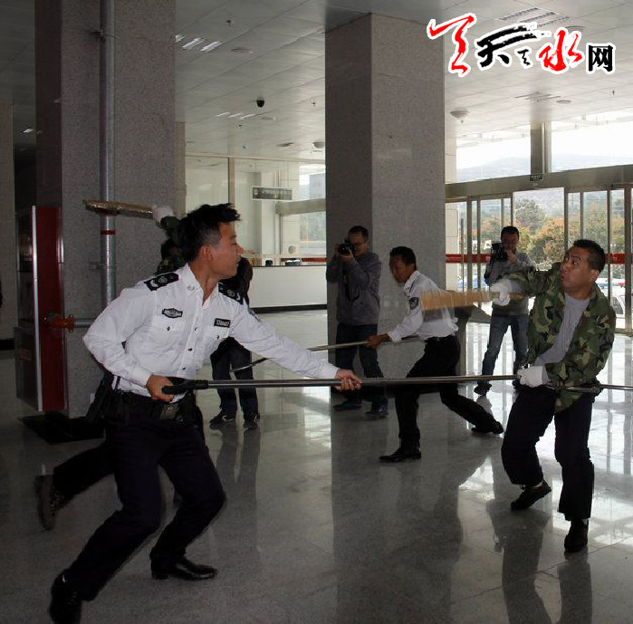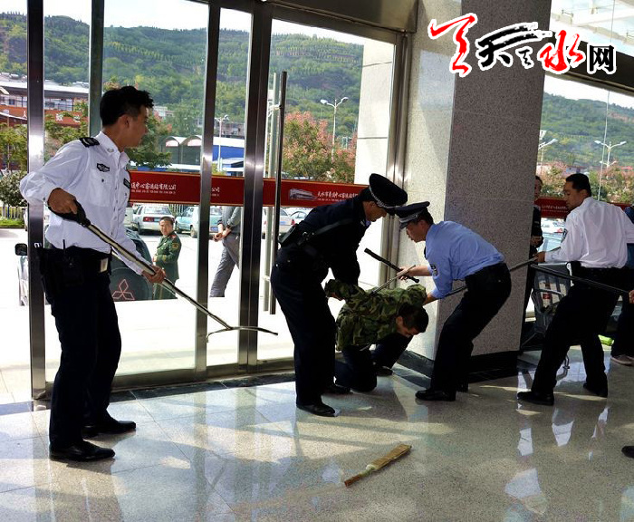 ????汽車客運(yùn)站暴恐事件應(yīng)急處置演練在中心客運(yùn)站售票大廳進(jìn)行,本環(huán)節(jié)演練的是車站工作人員對(duì)突發(fā)暴力恐怖事件的應(yīng)對(duì)和處置能力。演練中,兩名手持砍刀的犯罪分子向無(wú)辜乘客群眾揮刀亂砍,造成現(xiàn)場(chǎng)秩序混亂,人員受傷。現(xiàn)場(chǎng)工作人員在第一時(shí)間緊急出動(dòng),啟動(dòng)應(yīng)急預(yù)案,采取果斷措施,經(jīng)過(guò)生死拼搏將兩名犯罪分子成功制服,并及時(shí)將傷者送醫(yī)救治。