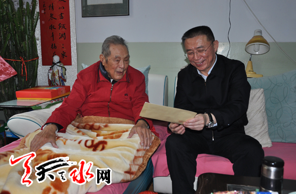 ????一走進(jìn)89歲原甘電公司黨委副書記秦業(yè)振的家,王銳就拉著老人的手拉家常。秦業(yè)振表達(dá)了對(duì)黨組織多年來(lái)的關(guān)心和照顧的感謝之情。王銳說(shuō),老干部為天水經(jīng)濟(jì)社會(huì)發(fā)展作出了突出貢獻(xiàn),是我們黨的寶貴財(cái)富,關(guān)心好你們的生活,是各級(jí)黨委和政府義不容辭的責(zé)任,老人在生活上有什么需求,我們一定會(huì)想方設(shè)法幫助解決。王銳特意叮囑隨行的市老干局負(fù)責(zé)同志,要以深厚的感情和更多的愛心,關(guān)心照顧好老干部的生活,確保他們心情舒暢,晚年幸福。臨走時(shí),王銳祝福秦業(yè)振老人節(jié)日快樂,健康長(zhǎng)壽。