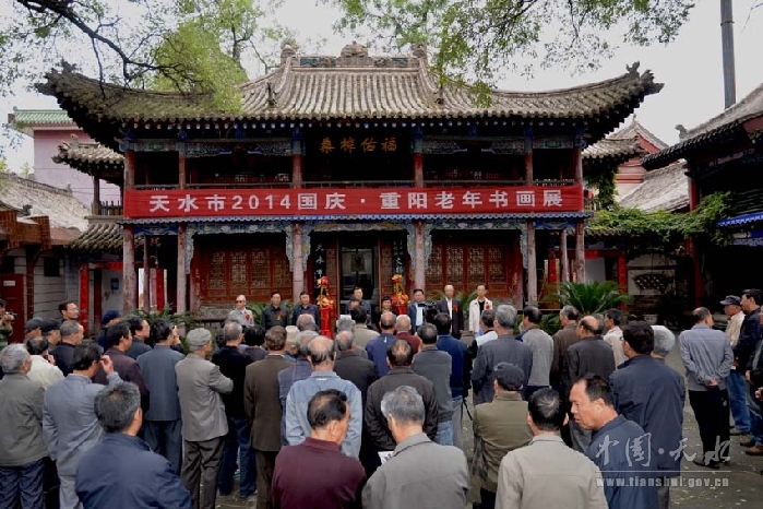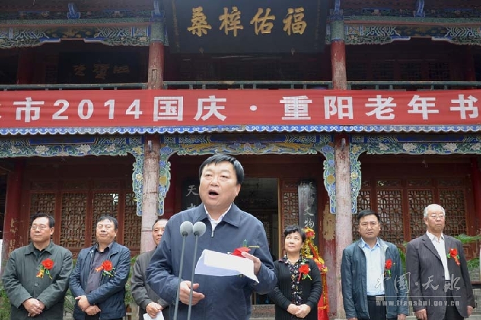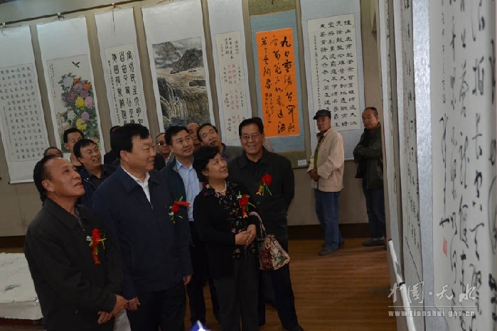 ????9月30日下午,在新中國成立65周年、第二個老年節(jié)和甘肅省第27個老人節(jié)即將來臨之際,由天水市老齡委主辦,市老齡辦、市老年書畫研究院承辦的天水市2014年“國慶·重陽”老年書畫展在天水市文化館隆重開幕。副市長雷鳴、市政協(xié)副主席何道華出席了開幕式。
