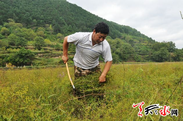 ????9月20日,麥積區(qū)利橋鄉(xiāng)的一整片坡地上,成片成片的柴胡長得郁郁蔥蔥。今年40多歲的趙旭東正在地里收割已經成熟的柴胡。