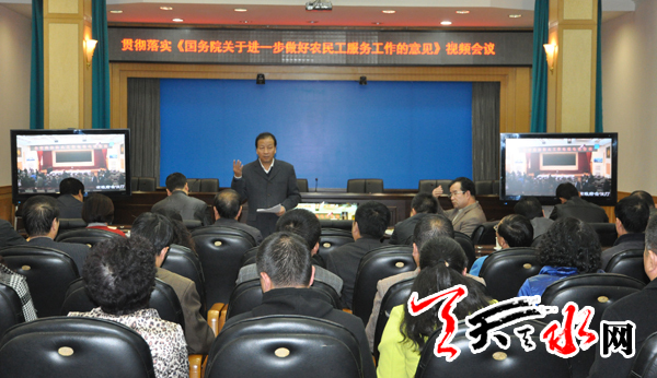 ??? 天天天水網(wǎng)訊【記者 王曉馨】 10月28日,國務(wù)院農(nóng)民工工作領(lǐng)導(dǎo)小組關(guān)于貫徹落實(shí)農(nóng)民工服務(wù)工作視頻會議后,市委常委、常務(wù)副市長郭奇若主持召開會議,就如何貫徹落實(shí)好會議精神,做好全市農(nóng)民工服務(wù)工作進(jìn)行了安排部署。