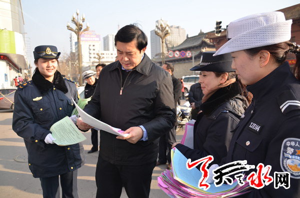 ??? 天天天水網(wǎng)訊【見習(xí)記者 馮麗娟】12月18日,中共天水市委常委、政法委書記趙衛(wèi)東帶領(lǐng)市公安、運(yùn)管、工商、教育、規(guī)劃、建設(shè)、兩區(qū)政府等部門負(fù)責(zé)人先后到秦州、麥積兩區(qū)部分主城區(qū)道路口、火車站以及城區(qū)內(nèi)易堵的交通節(jié)點(diǎn),督查綜合整治道路交通秩序開展情況。