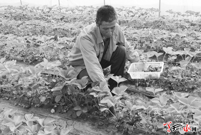 ????4月19日,清水縣農(nóng)業(yè)科技示范園區(qū)內(nèi),紅堡鎮(zhèn)的蔡義周正在大棚內(nèi)采摘自己種植的草莓。
