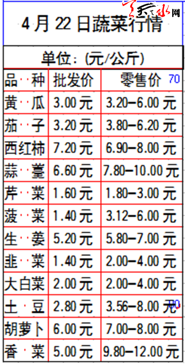 ????來自天水瀛池果菜批發(fā)市場的統(tǒng)計數(shù)據(jù)顯示:和4月15日相比,22日蔬菜的批發(fā)價有跌有漲,其中土豆、茄子的批發(fā)價保持平穩(wěn),黃瓜、西紅柿、生姜、胡蘿卜和香菜的批發(fā)價漲了,而蒜薹、芹菜、菠菜、韭菜、大白菜的批發(fā)價降了。從零售價來看,上述菜品中,西紅柿、胡蘿卜和香菜的價格上揚明顯,黃瓜降了點,其他菜品“穩(wěn)”字當頭。