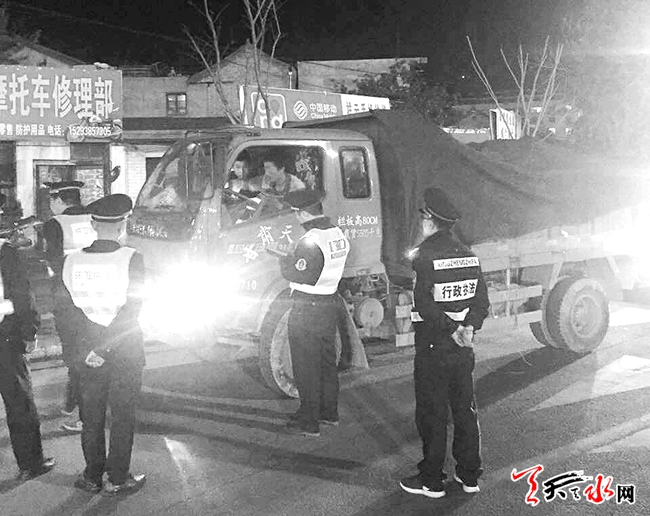????4月24日夜間,秦州區(qū)綜合執(zhí)法、環(huán)衛(wèi)、交警、運管等部門聯(lián)合執(zhí)法,設多個檢查點,對城區(qū)范圍內(nèi)夜間運輸渣土的車輛進行集中整治,尤其對遺撒渣土、運輸揚塵物品不遮蓋密封、帶泥上路污染路面等違章行為進行清查治理,進一步規(guī)范運輸行為。