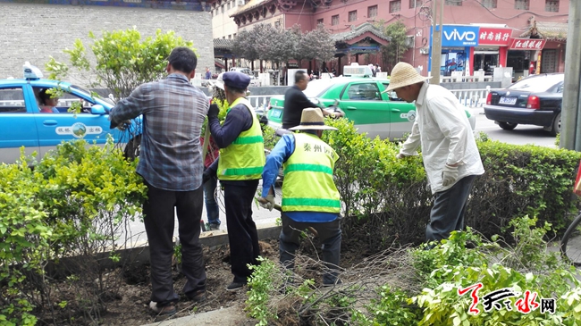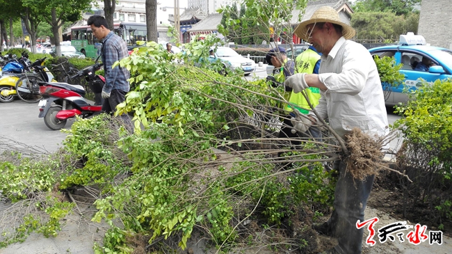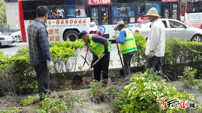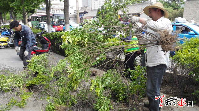 ????天天天水網(wǎng)9日17時訊 【記者?李旺旺】5月9日,記者在民主路看到,工人正在補栽路邊的綠化樹。