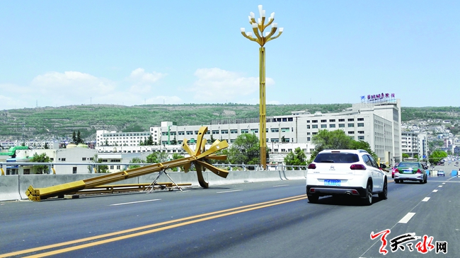 ????5月9日中午,在藉河雙橋大橋上,艷陽高照,車來人往。橋面上倒置著多桿待裝的路燈,有工人正在燈頭架邊緊張忙碌著,已有至少1桿路燈安裝到位。正在工作的吳師傅告訴記者,大橋上共有路燈40桿,安裝到位大約需要一周時(shí)間,他們有七八位工人負(fù)責(zé)此項(xiàng)工作。
