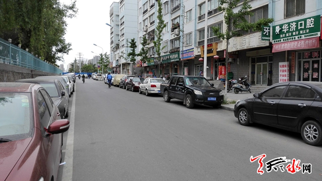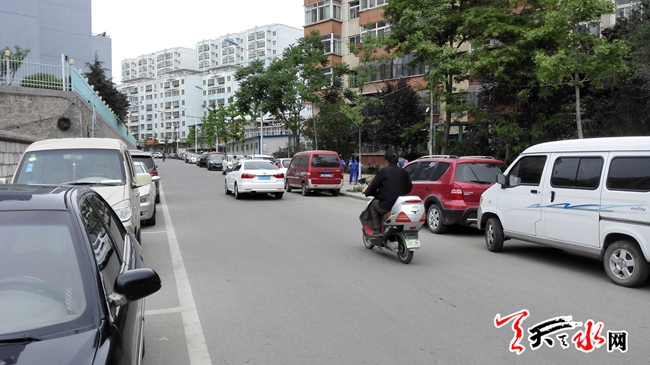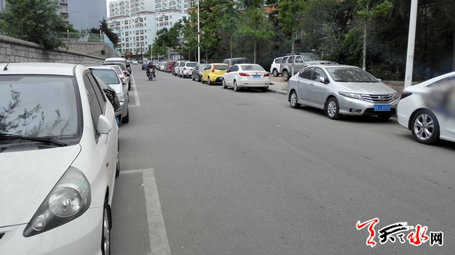 ????天天天水網(wǎng)12日15時(shí)訊 【記者 劉曉亞】5月12日,在岷玉路通往東方紅小區(qū)方向的馬路北側(cè),停著上百輛車,可是與路南側(cè)的停車相比,北側(cè)的停車腳下都沒有劃線,這就是說(shuō)這些車全部是違規(guī)停車。