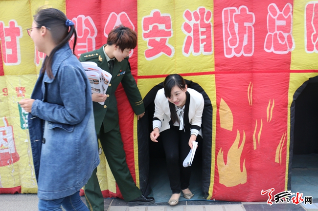 ????天天天水網5日14時訊【記者蔚軍平 通訊員鄧福強】5月12日上午,在秦州區(qū)龍城廣場,市民在市公安消防支隊設置的“煙熱室”內體驗逃生自救。