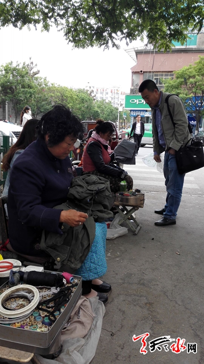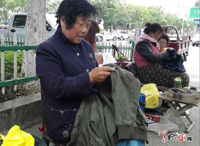????天天天水網(wǎng)12日17時(shí)訊 【記者 邵蘭霞】5月12日下午,在我市移動(dòng)大廈附近有一些專門從事手工縫衣的大嫂大媽,年齡在四十歲以上,一把剪刀、幾根針線變成了她們手中謀生的工具,她們?nèi)齻€(gè)、五個(gè)坐在樹下,無(wú)論嚴(yán)冬、酷暑,手里拿著一根細(xì)細(xì)的針,在仔細(xì)的縫補(bǔ)手中的衣服。