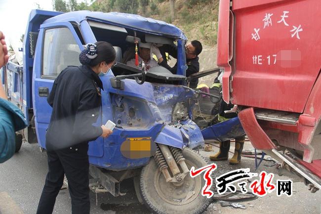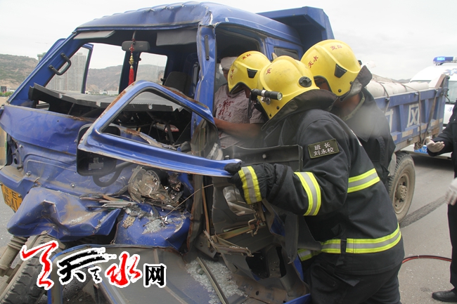 ??? 天天天水網(wǎng)12日17時(shí)訊【記者 蔚軍平 通訊員 李保磊】5月12日下午,在310國(guó)道麥積區(qū)潘集寨加油站附近發(fā)生一起兩車(chē)相撞的交通事故,一人被困在變形的三輪車(chē)中,經(jīng)過(guò)消防官兵緊張施救,最終將被困駕駛員成功救出。