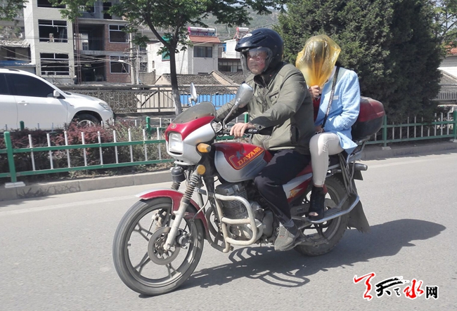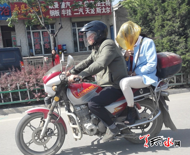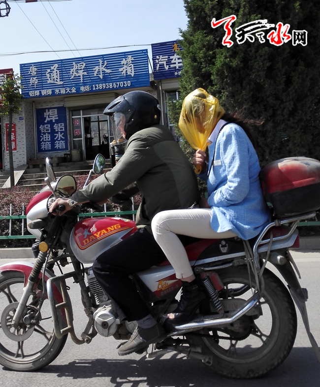 ????天天天水網(wǎng)16日11時訊 【記者 永德 文都 楊旭 明輝】5月16日上午,一輛摩托上的兩個駕乘者,一個戴頭盔,另一個卻在頭上套了一個塑料袋,這樣的避險方式實在讓人擔心。天天天水網(wǎng)提醒司機朋友,行車在路上,切不可“玩笑”。