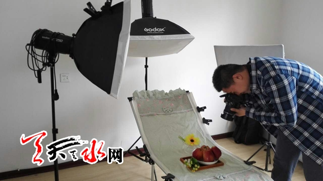 ????天天天水網(wǎng)17日20時(shí)訊【記者蔚軍平】5月17日下午,在天水匯橋電子商務(wù)有限公司,網(wǎng)店美工正在為銷(xiāo)售的蘋(píng)果拍照,為公司網(wǎng)店制作產(chǎn)品銷(xiāo)售的精美圖片。