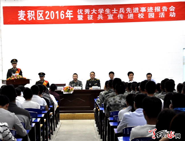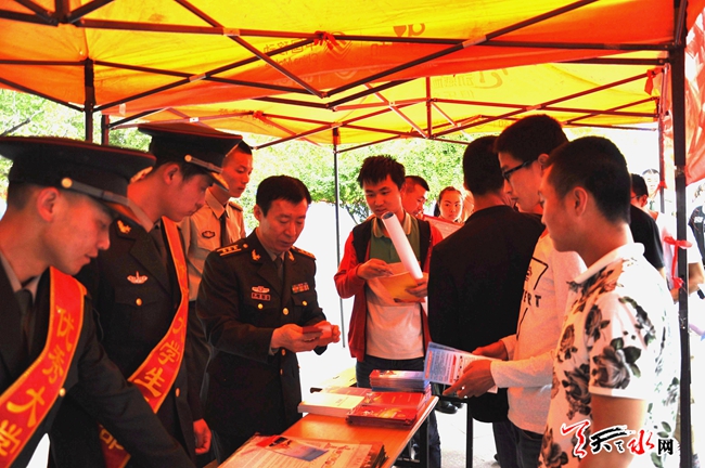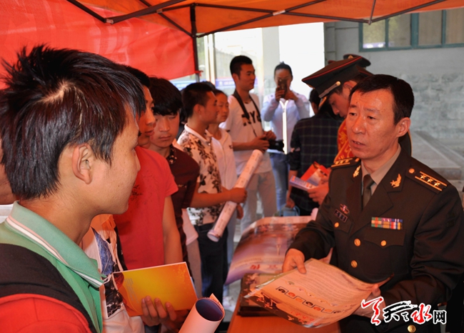 ????天天天水網(wǎng)19日15時(shí)訊 【記者 趙曉玲】5月19日,天水市夏季征兵宣傳工作已全面展開(kāi)。記者了解到,為做好今年夏秋季大學(xué)生征兵工作,5月18日,麥積區(qū)人武部官兵走進(jìn)省林業(yè)職業(yè)技術(shù)學(xué)院、省工業(yè)職業(yè)技術(shù)學(xué)院宣傳征兵政策,鼓勵(lì)廣大適齡學(xué)生應(yīng)征入伍。在現(xiàn)場(chǎng)征兵宣傳咨詢(xún)點(diǎn),大學(xué)生踴躍詢(xún)問(wèn),參軍熱情高漲。并向?qū)W生發(fā)放《征兵宣傳冊(cè)》。