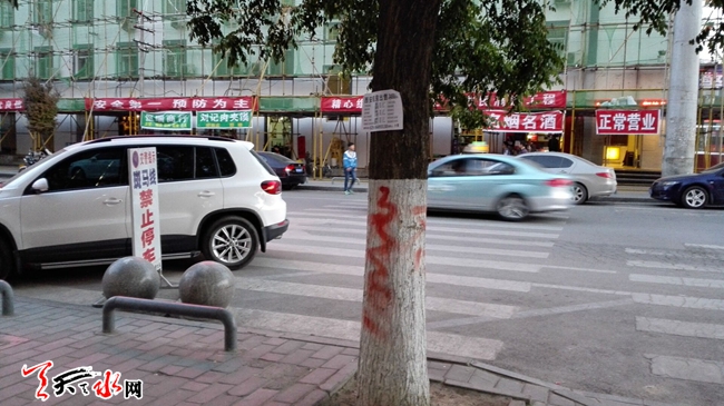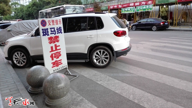 ????天天天水網(wǎng)19日20時(shí)訊(記者 蘇中豹)5月19日傍晚,在秦州區(qū)長途汽車站門東邊的一條斑馬線上,停放著兩輛小車,其中一輛白色SUV更是任性地緊挨著一面交警禁停牌停著,而全然不顧牌子上斗大字符的警示語:“交警提示:斑馬線上禁示停車!”,來往行人觀之亦不禁愕然。