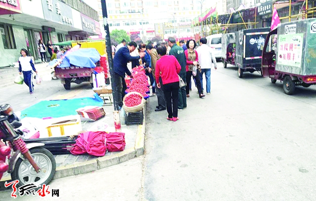 ????5月21日,記者途經(jīng)秦州區(qū)重新街南口時(shí)看到,該路段人行道被當(dāng)做一個(gè)集中售賣櫻桃的臨時(shí)市場(chǎng),攤販將櫻桃擺在緊挨馬路的道牙邊,購買櫻桃的市民便大量擁擠在馬路上,而馬路另外一側(cè)還停了不少代理櫻桃快遞業(yè)務(wù)的快遞車,導(dǎo)致整個(gè)重新街交通擁堵不堪,人車通行十分困難。希望有關(guān)部門能對(duì)這里的櫻桃臨時(shí)售賣區(qū)域的秩序加以管理,勿讓攤販和人群擠在馬路上,以便其他市民出行。(記者 賈敏 攝)