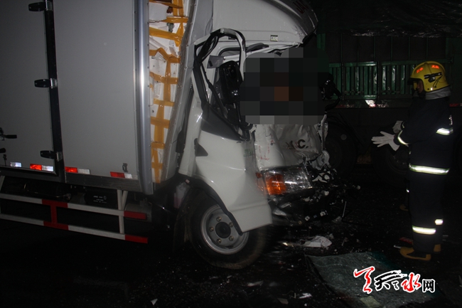 ????天天天水網(wǎng)25日訊【記者蔚軍平通訊員伏龍】5月25日上午,記者從我市消防部門獲悉,5月24日深夜,在天定高速公路秦州區(qū)關(guān)子鎮(zhèn)路段發(fā)生一起交通事故,外地的一輛廂式貨車與一輛半掛車相撞后,致使廂式貨車駕駛室嚴(yán)重變形,駕駛員不幸身亡。