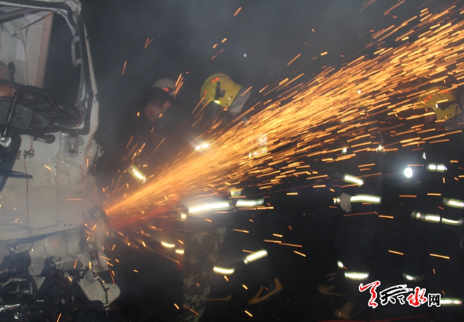 ????據(jù)參與救援的天水郡消防中隊(duì)指揮員介紹,官兵于凌晨1時(shí)許到達(dá)現(xiàn)場(chǎng),經(jīng)偵查發(fā)現(xiàn),車牌為安徽省的一輛廂式貨車,駕駛室受撞擊后已經(jīng)嚴(yán)重變形,駕駛員被困在座位上,官兵多次喊話也無應(yīng)答,經(jīng)到場(chǎng)的120救護(hù)人員診斷后,確認(rèn)被困駕駛員已經(jīng)不幸身亡。